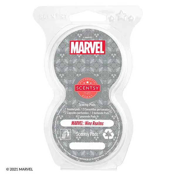 Marvel: Nine Realms Scentsy Pod Twin Pack – order direct from Scentsy online shop. A heroic mix of lime zest and blue tea keeps you connected to the universe, while lavender lightning really packs punch. Air flows through Scentsy Pods and into the environment for immediate fragrance. The fragrance beads in the Pods release the perfect amount of scent for an incredible experience in your favorite Scentsy fragrances. Each Scentsy Pod provides up to 120 hours of fragrances. Pack of 2.