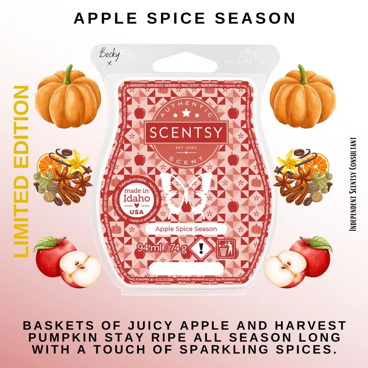 Apple Spice Season:?Baskets of?juicy apple?and?harvest pumpkin?stay ripe all season long with a touch of?sparkling spices.