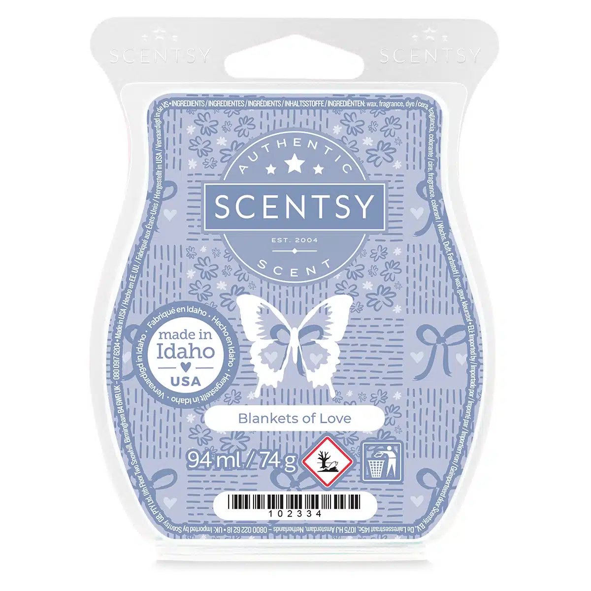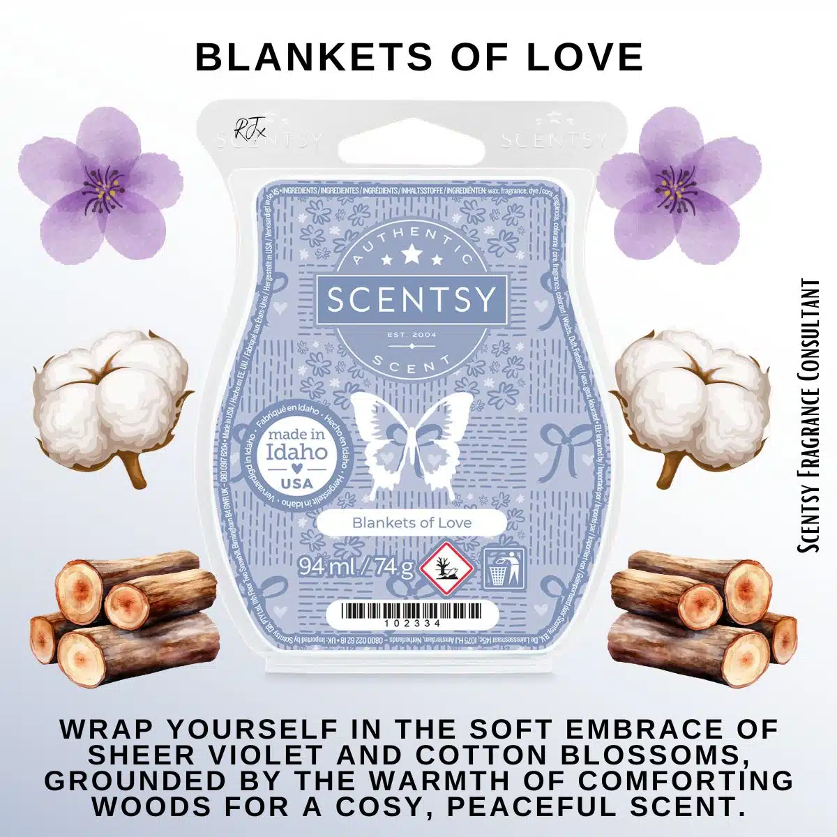 “Blankets of Love Scentsy Bar ? Wrap yourself in the soft embrace of sheer violet and cotton blossoms, grounded by the warmth of comforting woods for a cosy, peaceful scent.”
