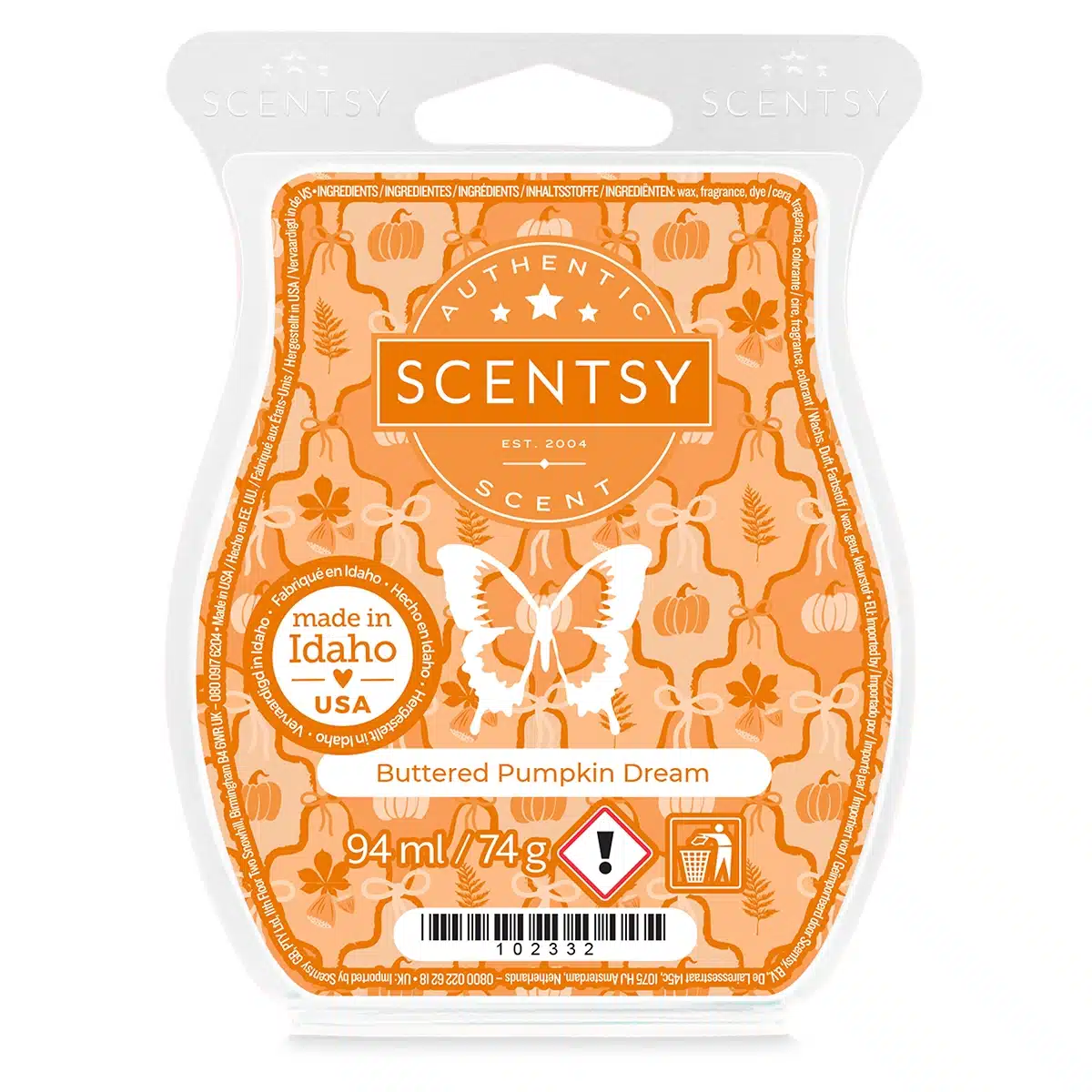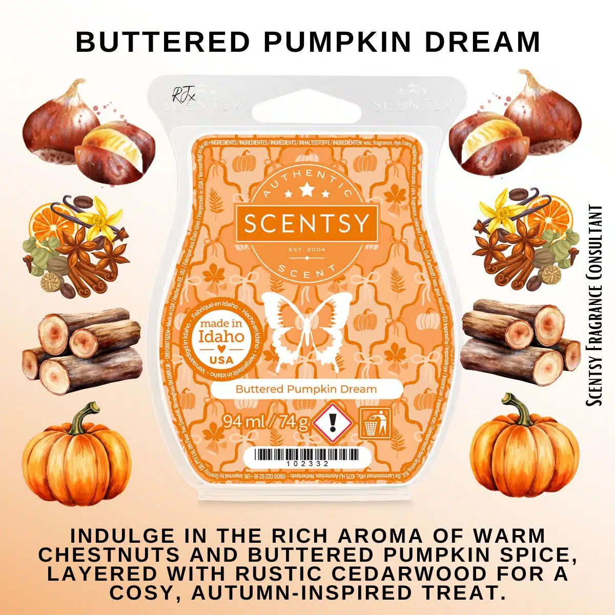 “Buttered Pumpkin Dream Scentsy Bar ? Indulge in the rich aroma of warm chestnuts and buttered pumpkin spice, layered with rustic cedarwood for a cosy, autumn-inspired treat.”