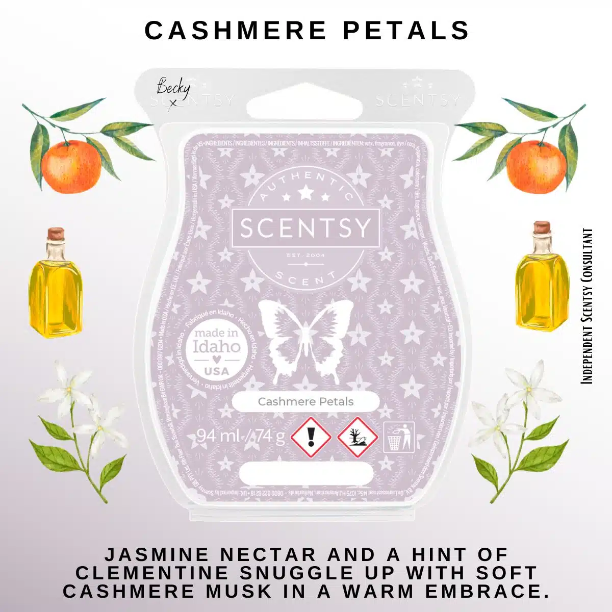 Jasmine nectar and a hint of clementine snuggle up with soft cashmere musk in a warm embrace.