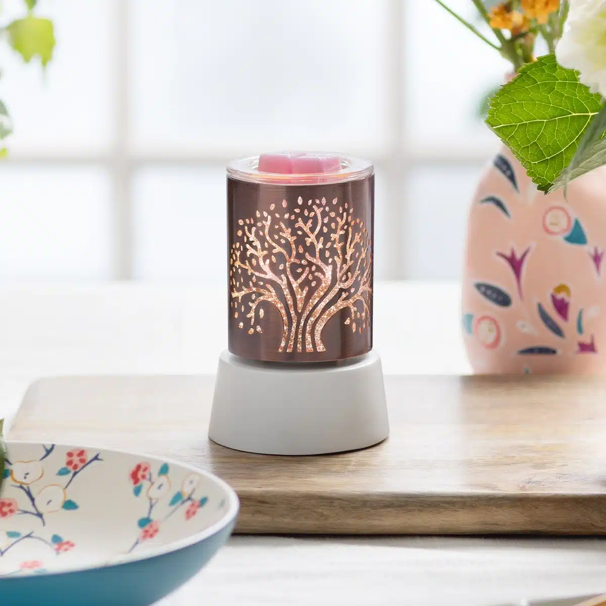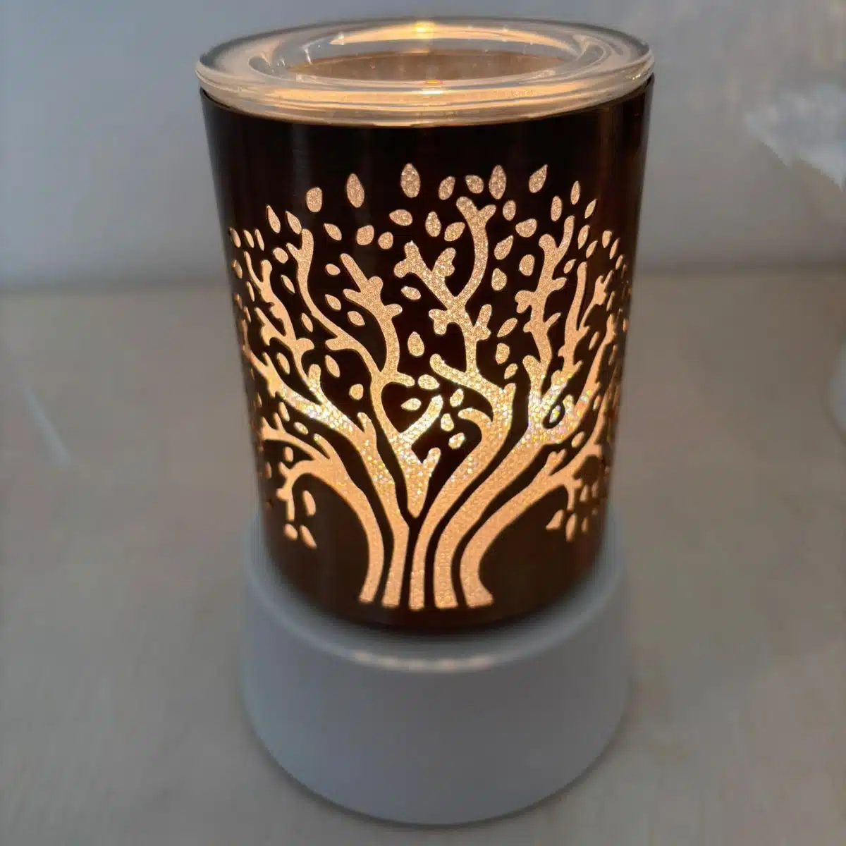 With an antique copper finish and a glittery interior sleeve that diffuses the light shining when lit, the beauty of this Mini Warmer runs deep.