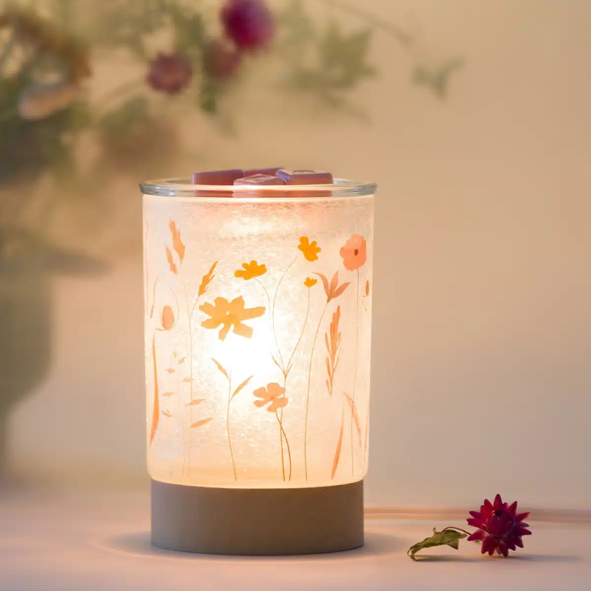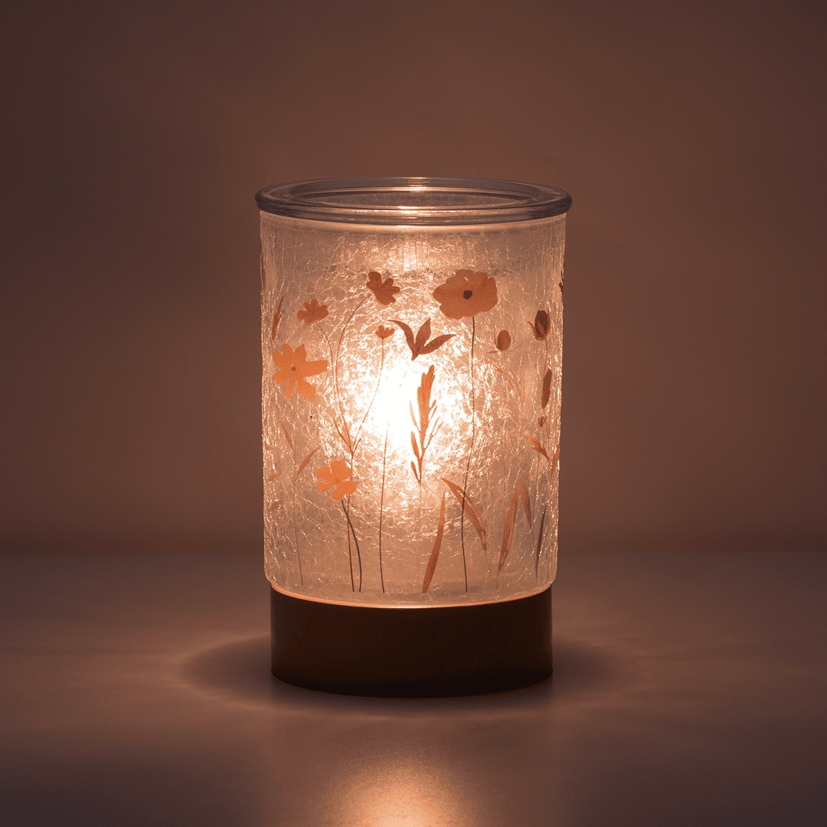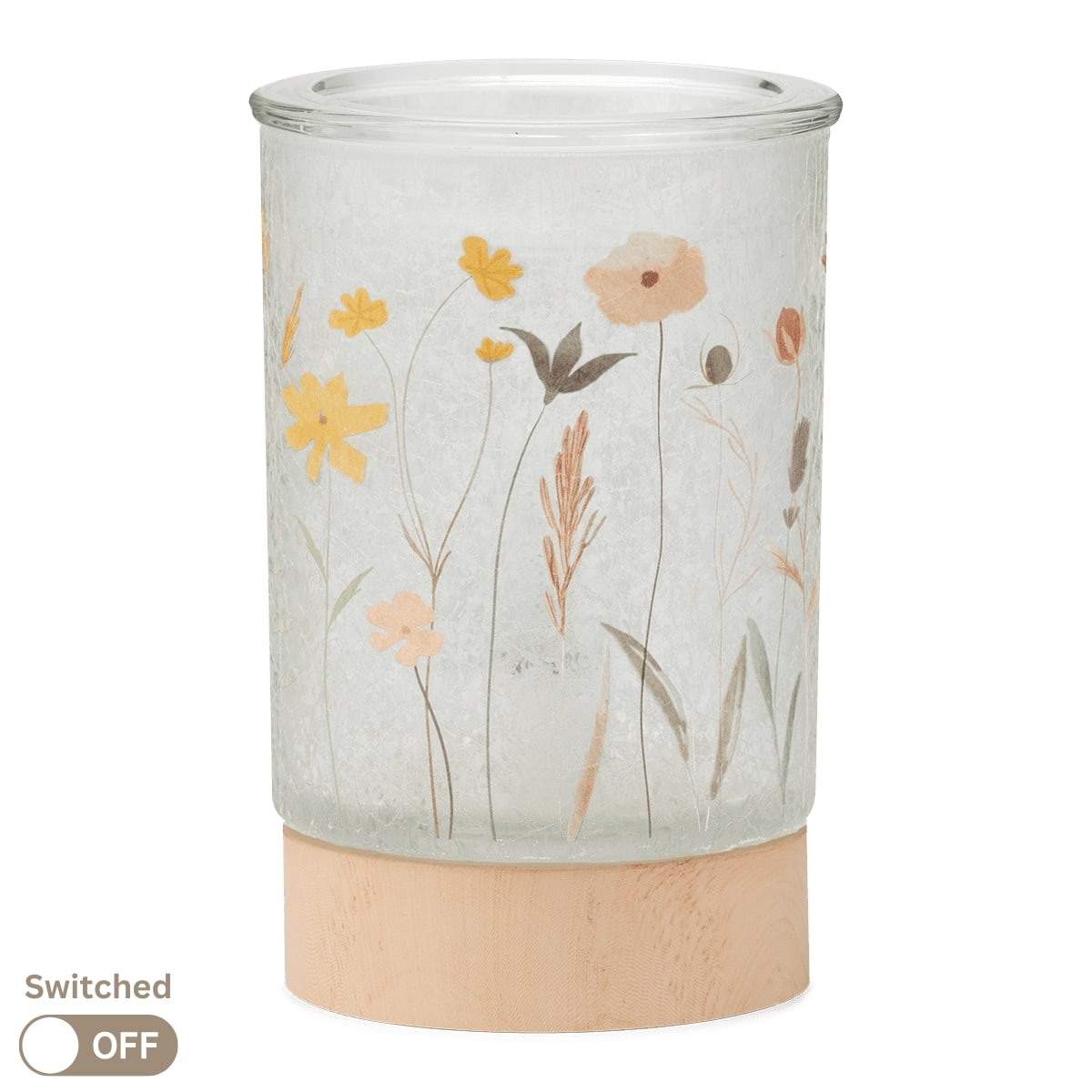 A delicate design reminiscent of pressed flowers preserves the beauty of a wildflower bouquet. A crystal texture and faux wood base finish the look.