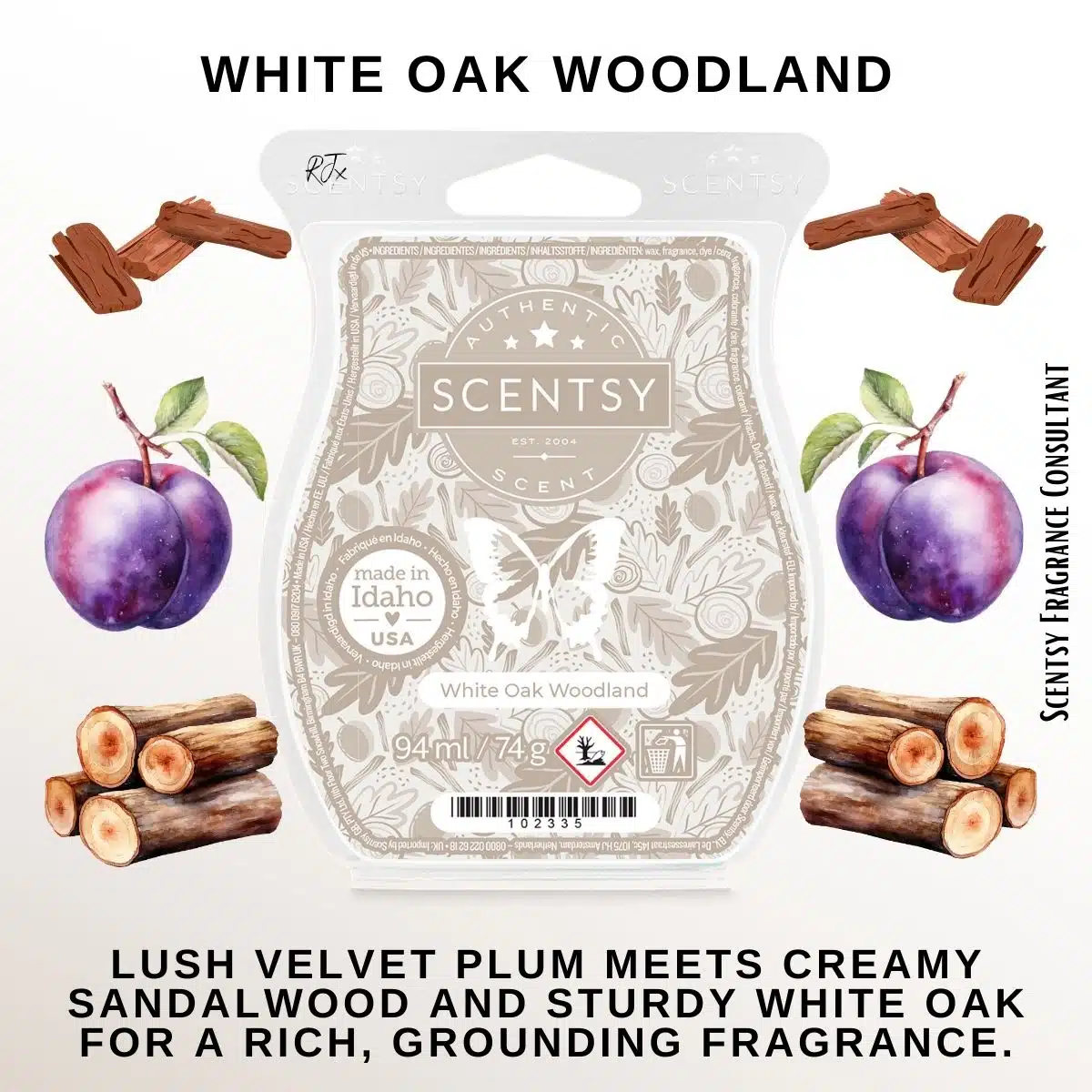 “White Oak Woodland Scentsy Bar ? Lush velvet plum meets creamy sandalwood and sturdy white oak for a rich, grounding fragrance.”
